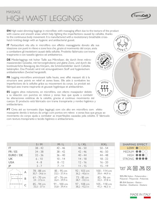 Legginsy z Linii Farmacell Massage z wysokim stanem, do kostek dzięki specjalnie opatentowanej wklęsło-wypukłej dzianinie o strukturze plastra miodu, która z każdym ruchem "pracuje" wywołując efekt delikatnego mikromasażu a to z kolei pomaga zwalczać cellulitis.