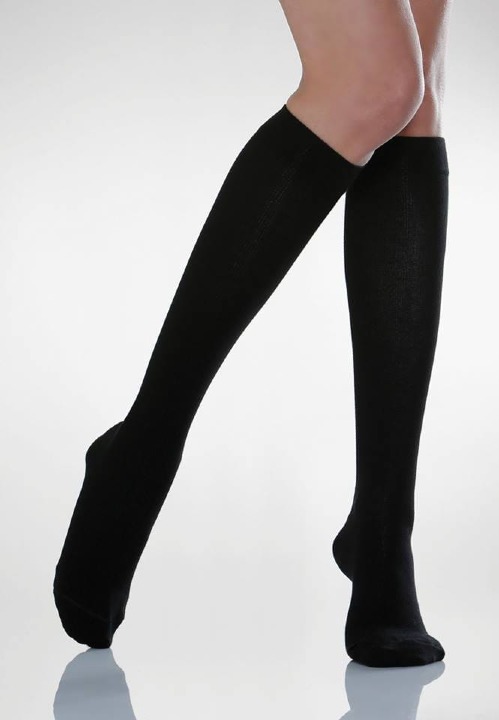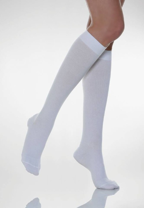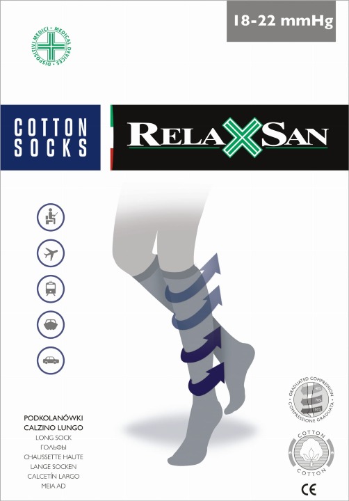 Podkolanówki przeciwżylakowe uciskowe, bawełniane o stopniowanym ucisku. Ucisk w kostce 18-22 mmHg - średnia kompresja. Podkolanówki dla kobiet i mężczyzn z dużą zawartością bawełny w składzie, atrakcyjne i wygodne w noszeniu, nie powodują ucisku w obrębie palców i pod kolanem, nie obsuwają się podczas chodzenia. Zapobiegają takim problemom z kończynami jak: zmęczenie, "ciężkość nóg", obrzęki, odczucie bolesności kończyn dolnych czy powstaniu tzw. "Zespołu Podróżnego".