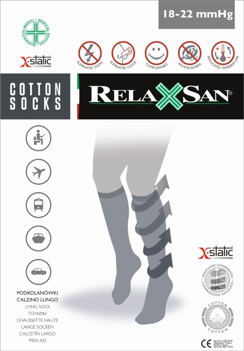 Podkolanówki przeciwżylakowe o stopniowanym ucisku, ze srebrnym włóknem X-Static. Ucisk w kostce 18-22 mmHg - średnia kompresja. Podkolanówki męskie z dużą zawartością bawełny w składzie, atrakcyjne i wygodne w noszeniu. Nie powodują ucisku w obrębie palców i pod kolanem, nie obsuwają się podczas chodzenia. Zapobiegają takim problemom z kończynami jak: zmęczenie, "ciężkość nóg", obrzęki, odczucie bolesności kończyn dolnych czy powstaniu tzw. "Zespołu Podróżnego".