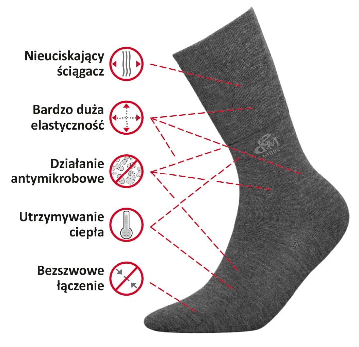 Bezszwowe łączenie nad palcami gwarantuje wygodę dla bardzo wrażliwych stopach, np. stopach cukrzycowych. Unikalne właściwości wełny merynosowej zapewniają utrzymywanie ciepła oraz absorpcję nadmiaru wilgoci.